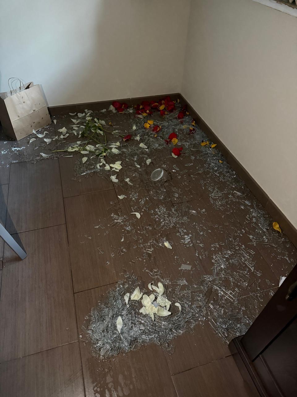 Photos from the scene show a small crater created by the drone, with smoke rising from the ground and holes in nearby windows. Inside the house, a window sill is covered in a thick layer of shattered glass and flower pots are overturned; a prayer book was placed next to shrapnel.